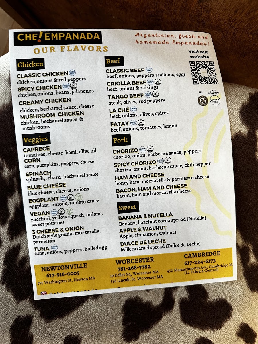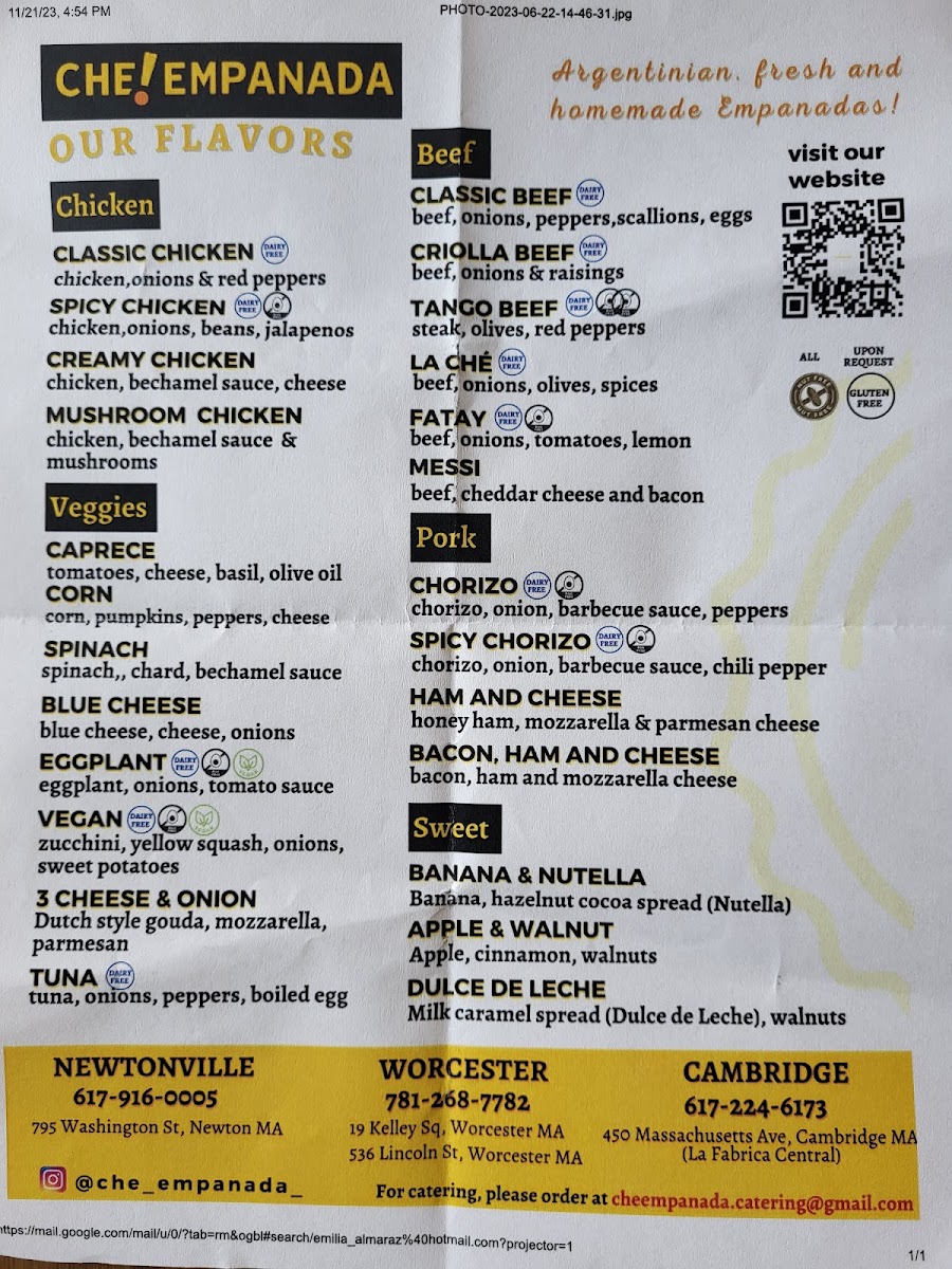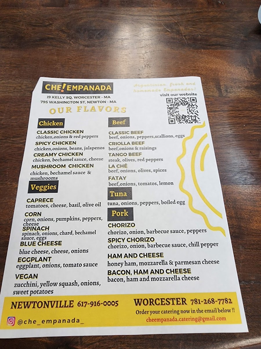 Located in the heart of Newton, MA, Che! Empanada serves an irresistible menu of freshly baked empanadas, each brimming with flavor and authenticity. The selection ranges from classic chicken and savory pork options, like the housemade chorizo and spicy chorizo, to delightful vegetarian choices featuring bleu cheese and caramelized onions.